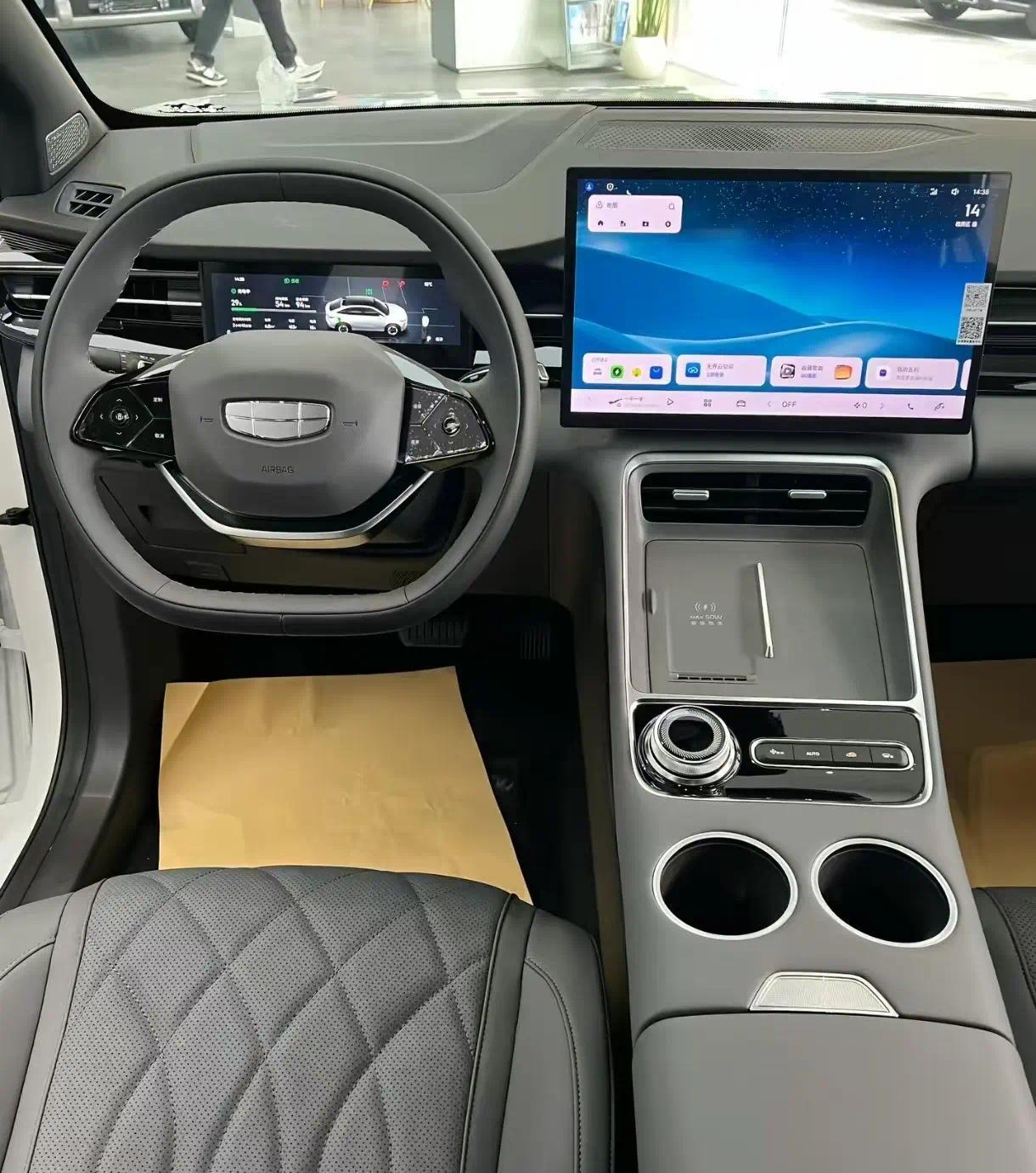 内饰方面,博越REV的低配车型提供黑色/星月灰的配色,中配和高配车型提供黑色/霞光棕、黑色/曙光橙的配色,采用电子怀挡,标配皮质多功能方向盘、8.8英寸液晶仪表、14.6英寸悬浮式中控屏,搭载Flyme Auto车机系统,支持车联网、OTA升级、手机APP远程控制、语音双区域唤醒识别等,支持HUAWEI HiCar、Carlink、Flyme link手机互联。