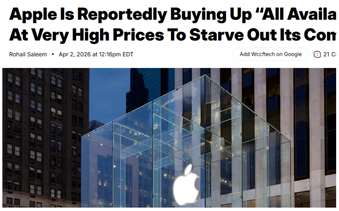 据报道,近日苹果正在以极高价格“买断市场上所有可用的移动DRAM”,即使以牺牲运营利润为代价,也要阻止竞争对手获得足够的内存芯片供应。