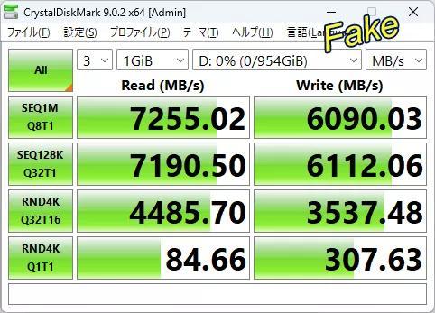 这次测试的假冒 1TB 三星 990 Pro 则更加逼真。在 CrystalDiskInfo 跑分中,这块假盘显示读取速度 7255MB/s、写入速度 6090MB/s,已经非常接近正品 990 Pro 的 7453MB/s 和 6953MB/s。